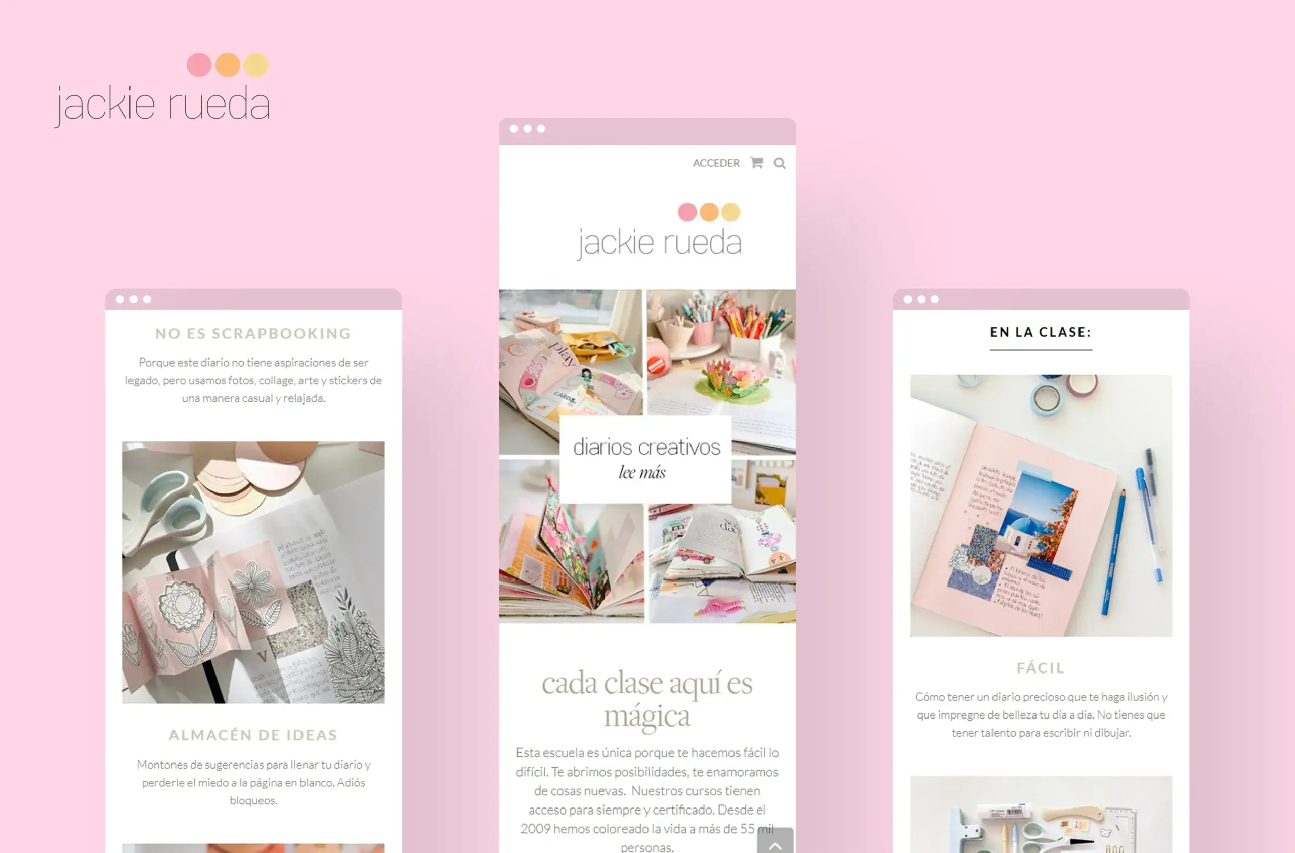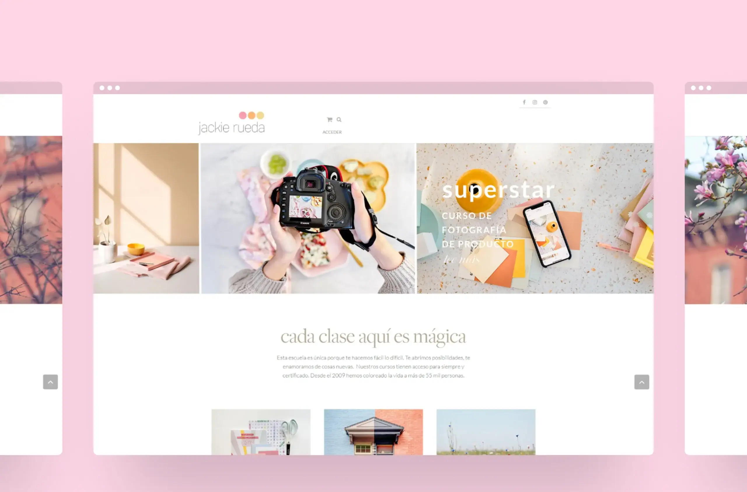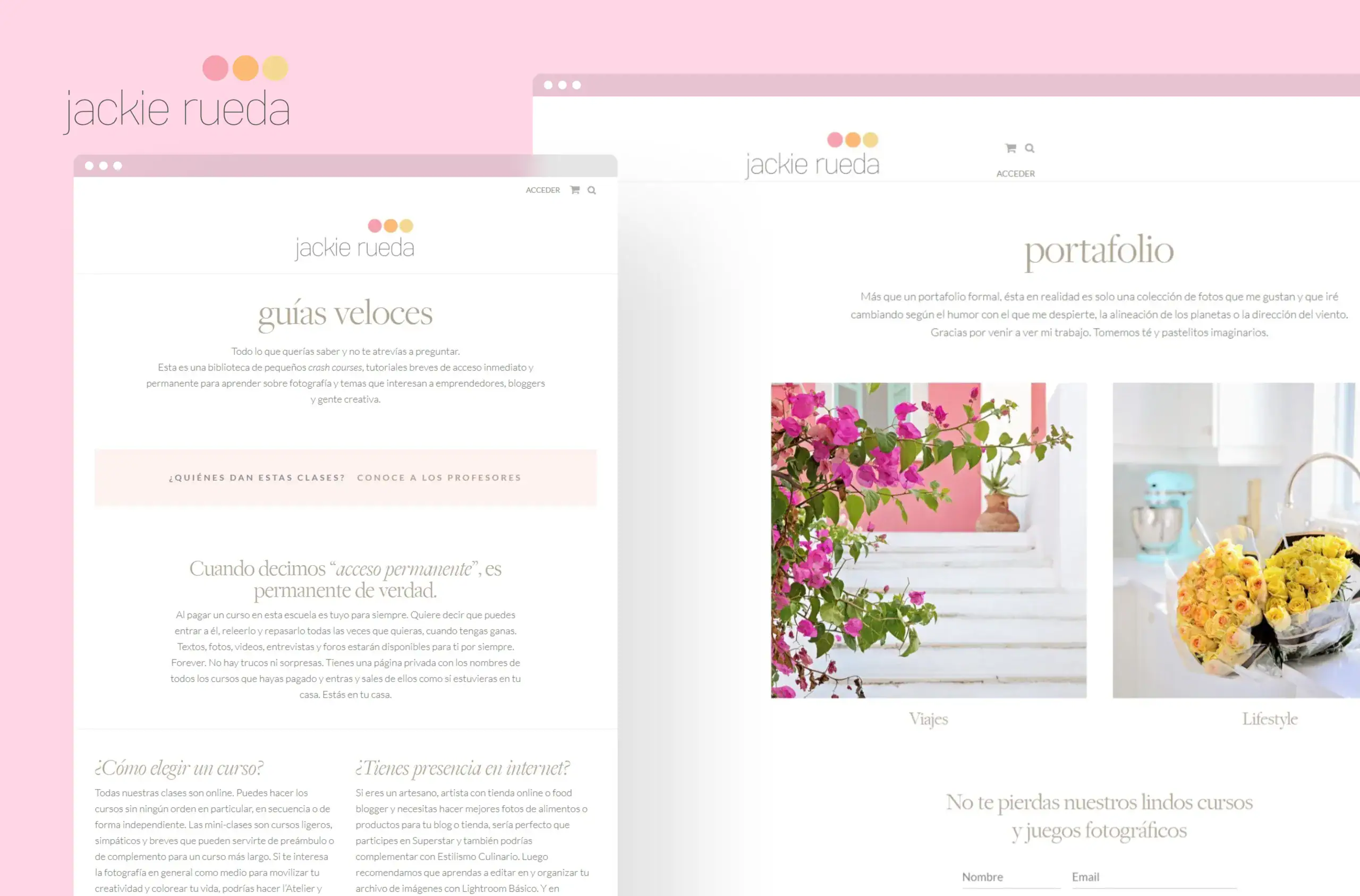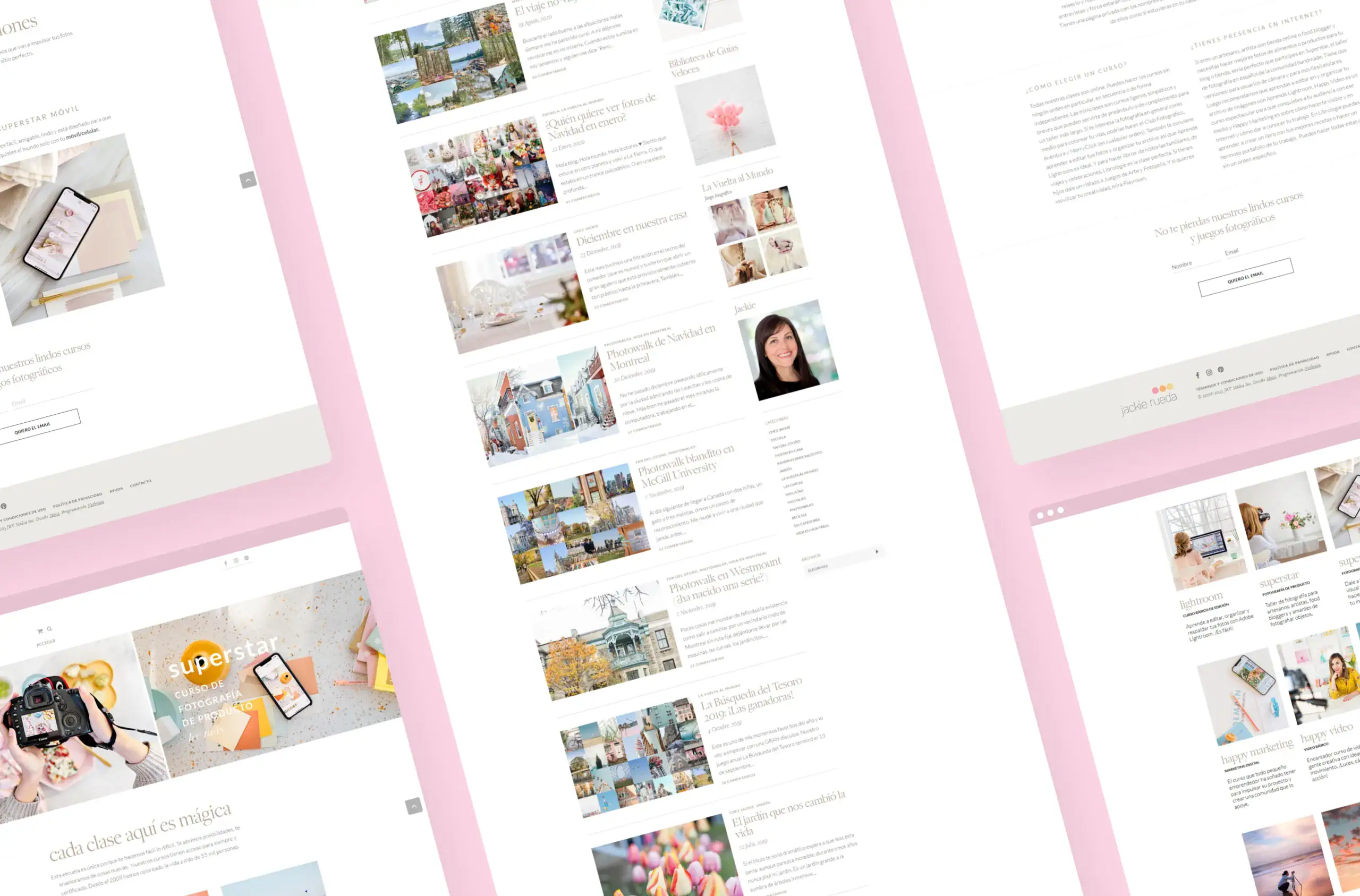 Para Jackie Rueda, escuela online referente en fotografía, estilismo y narrativa visual, diseñamos y desarrollamos una plataforma web que traslada la cuidada estética de la marca al entorno educativo digital. El sitio prioriza una arquitectura de la información envolvente y clara, facilitando el acceso a un amplio catálogo de talleres y recursos mediante una navegación fluida que pone en valor el componente visual y artístico de cada curso.